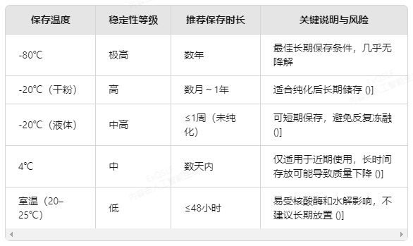 以下表格總結(jié)了PCR產(chǎn)物在不同溫度條件下的穩(wěn)定性和推薦保存時長: